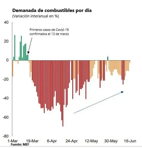 Aunque todavía muy tímidamente, en el mes de junio empezaron a asomar algunas señales positivas. Desde el Poder Ejecutivo destacan especialmente la evolución de la demanda de combustibles y el consumo de energía eléctrica, con mejores números respecto a abril y mayo.