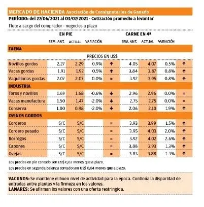 La vaca especial, bien completa, cotiza en US$ 3,95 como precio de punta. En esta categoría el rango de valores es más amplio dependiendo del peso y la calidad, con un piso en US$ 3,75.