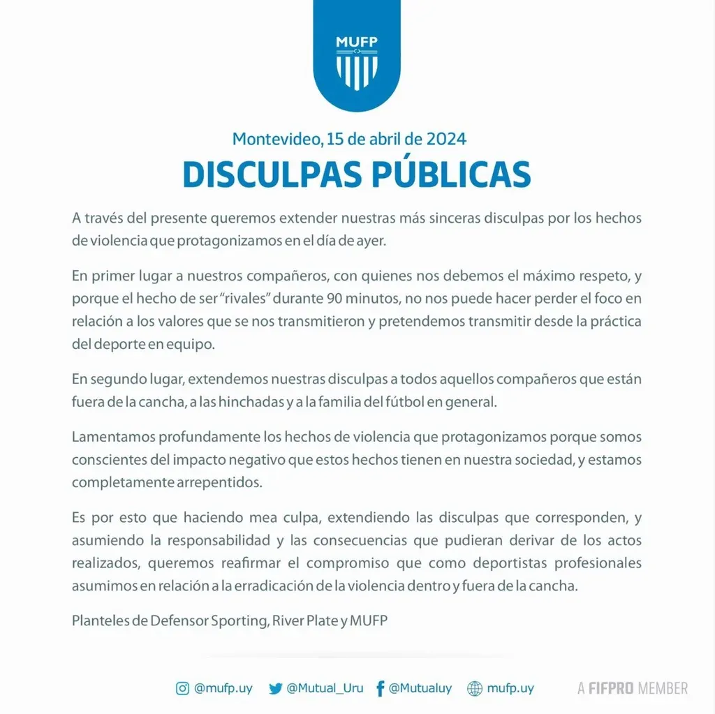 La Mutual Uruguaya de Futbolistas Profesionales emitió en la noche de este lunes un comunicado conjunto a través del cual los jugadores de Defensor Sporting y River Plate pidieron disculpas por los hechos de violencia que protagonizaron el domingo en el Franzini una vez terminado el partido correspondiente a la octava fecha del Torneo Apertura.