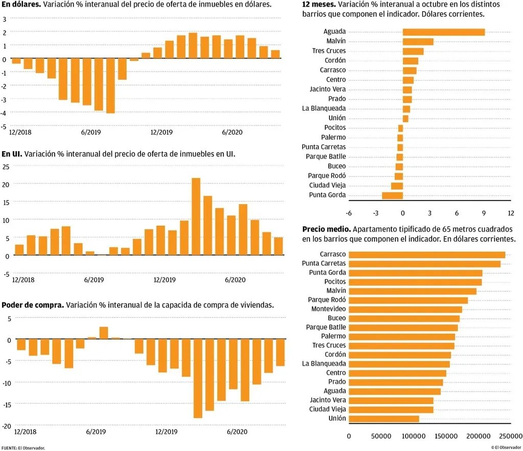 De hecho, cuando se miden en unidades indexadas (UI), los precios de los inmuebles no variaron en octubre y acumularon una baja de 2,9% respecto a julio de este año y de 6,7% con relación a marzo. Todo esto, producto del aumento de los precios al consumo en Uruguay, en un contexto de dólar estable.