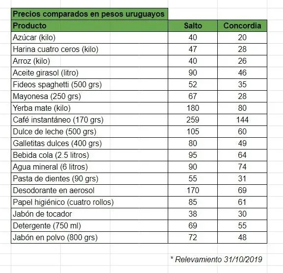 A modo de ejemplo, una comparación de precios realizada por El Observador entre un supermercado de Salto y otro de Concordia muestra claramente la diferencia. Los 18 productos seleccionados, entre los que hay harina, fideos, azúcar, arroz, agua mineral, desodorante y papel higiénico, además de otros artículos de primera necesidad se comercializan a valores más altos a este lado del río (ver recuadro).