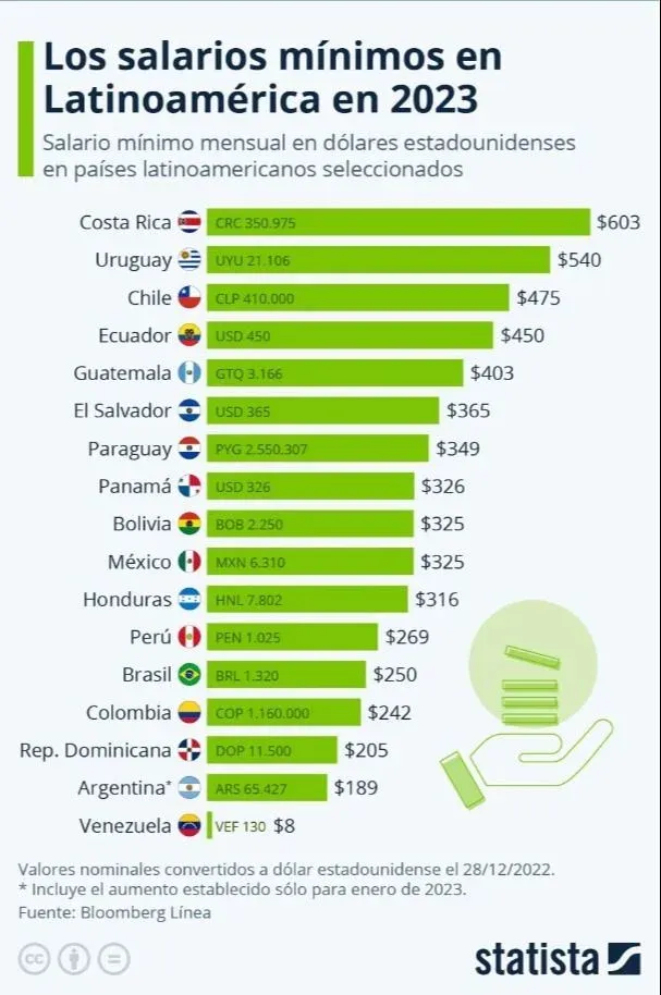 Tercero se ubicó Chile, cuyo salario mínimo mensual es de US$ 475 y un IDH también “muy alto”. Completaron el top cinco del ranking Ecuador y Guatemala que, con un sueldo de US$ USD 450 y de US$ 403 respectivamente, poseen, además, un desarrollo humano más bajos en comparación con los tres países mencionados al comienzo.