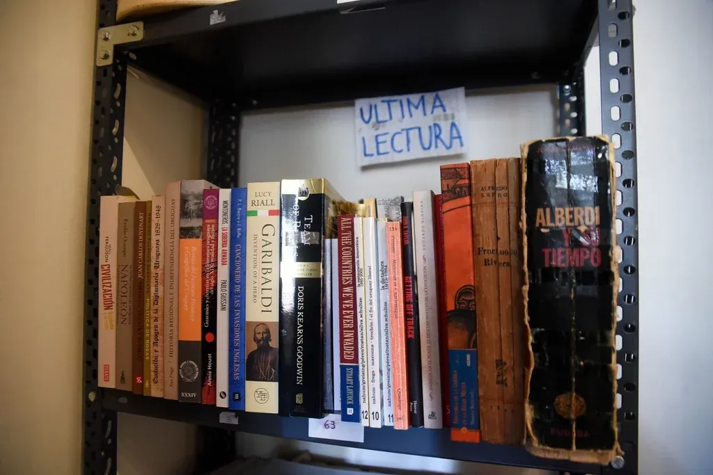 En un estante están sus últimas lecturas: Alberdi y su tiempo, Historia de la guerra de la Edad Media, Darwin en el Plata. Uno sobre Garibaldi, otro sobre Rivera y uno sobre Bello y Miranda que tiene una dedicatoria de Hugo Chávez.
