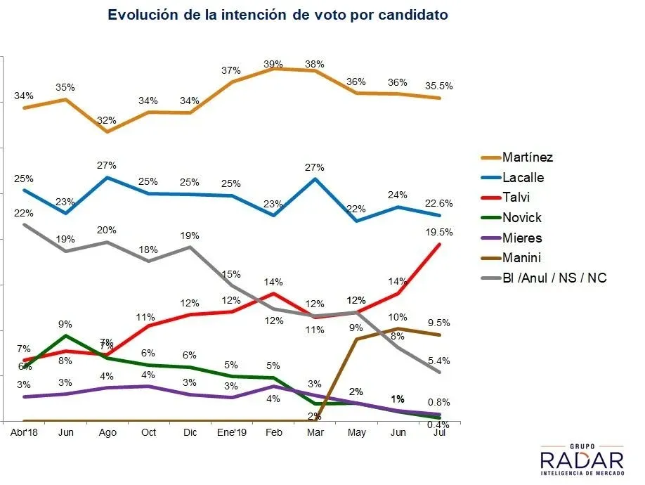 Con los candidatos definidos y la mayoría de fórmulas cerradas, Radar presentó este martes la primera encuesta de intención de voto realizada luego de las elecciones internas según partidos políticos de cara a octubre. Según el estudio, Daniel Martínez (Frente Amplio) lidera con 35,5% de la intención de voto, seguido de Luis Lacalle Pou (Partido Nacional) con 22,6% y en tercer lugar Ernesto Talvi (Partido Colorado) con 19,5%.