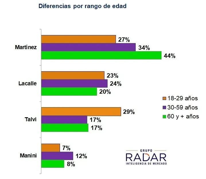 Cuando se analiza la intención de voto por rango de edad, se observa que la mayoría del electorado de Martínez (44%) tiene 60 años y más. En el electorado de Lacalle Pou la intención de voto se reparte equitativamente por franja etaria. Los que apoyan a Talvi, en cambio, son en su mayoría jóvenes de entre 18 y 29 años.