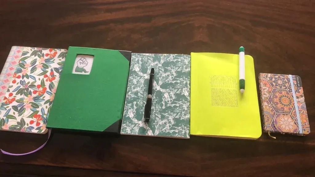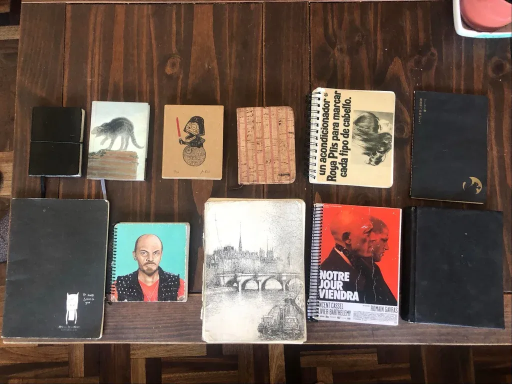 Tengo libretas y cuadernos, muchos, algunos muy grandes, y los tengo desde que escribo. Empecé a escribir en una máquina de escribir eléctrica y enseguida noté que corregir era difícil. Al principio anotás en servilletas o cosas así, pero después eso se te pierde, y la libreta siempre es útil. Muchas veces llevo un cuaderno o dos a los viajes o a mis ensayos de todos los días. Me funcionan también como agenda; no tengo una libreta creativa, sino que es multiuso.