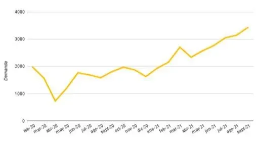 En setiembre, la demanda de trabajo en Uruguay se incrementó por quinto mes consecutivo. Según los principales portales laborales relevados por Advice, la generación de oportunidades de trabajo se incrementó en 284 propuestas el pasado mes, lo que supone una tasa de crecimiento de 9% frente a agosto. Con respecto a setiembre de 2020 (en plena pandemia), el incremento fue de 1.625 llamados, lo que representa 90% de aumento.