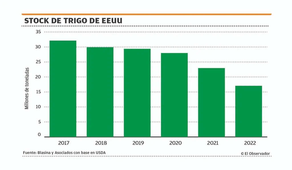 La producción estadounidense de trigo aparece en una caída fuerte que garantiza la firmeza hasta fines de 2022, al menos para la cebada uruguaya que se referencia con los precios del trigo en Chicago. La proyección fue recortada por el USDA de 47,52 a 46,18 millones de toneladas, la más baja desde 2003, como consecuencia del ajuste a la baja del rinde promedio que no llegaría a 3.000 kilos por ha. No fueron reducidas las perspectivas de exportación, que se mantuvieron en 23,81 millones de toneladas. La estimación sobre las existencias finales fue ajustada de 18,09 a 17,05 millones de toneladas y quedó debajo de los 17,5 millones previstos por los privados.