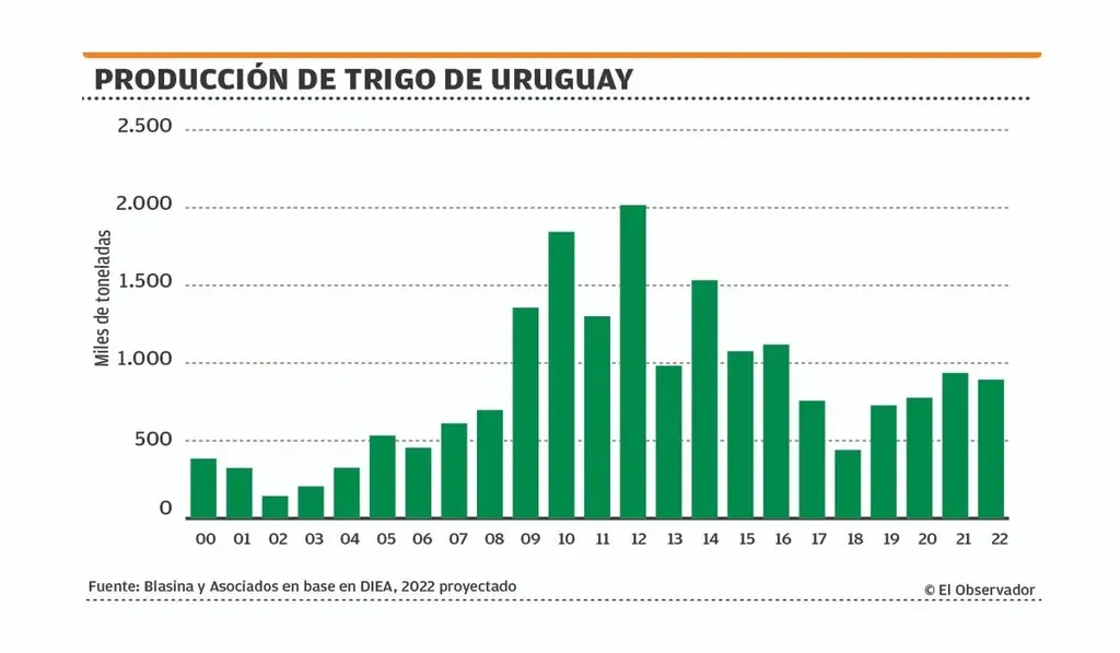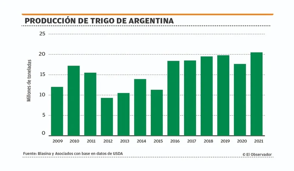 La producción total de trigo en Uruguay para 2020/2021 se ubicó en 936.000 toneladas, 20% superior que en el año anterior cuando se alcanzaron 776.000 toneladas, y la exportación podría alcanzar las 600.000 toneladas. Este año puede repetir un volumen del orden de 900 mil toneladas, que duplica al consumo interno y deja así un buen saldo exportable.