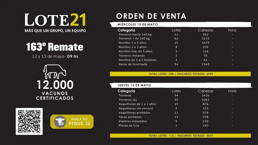 La subasta –100% virtual, sin público– se podrá seguir en vivo y en directo por lote21.com.uy y a través de las señales de DirecTV (canal 619) y CampoTV.