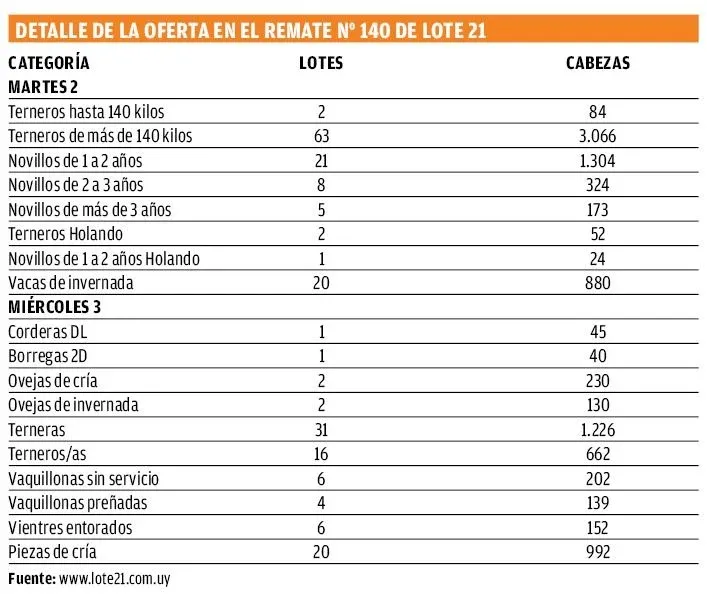 Con una oferta de 11.030 vacunos y 445 lanares –100% certificado–, el martes 2 y miércoles 3 de abril rematará Lote 21, desde el Hipódromo Nacional de Maroñas, comenzando en cada día a la hora 9:30 pudiéndose ofertar en el local o a distancia, viendo los lotes por DirecTV, Campo TV y Cablevisión y llamando al 2 511 76 73 o a los celulares de los escritorios.