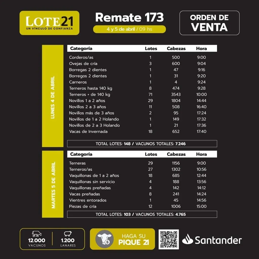 Lote 21 realizará su remate Nº 173 en dos jornadas, este lunes 4 y el martes 5 de abril, a partir de la hora 9, desde el Club de Golf del Uruguay. Se pondrá en consideración de los inversores una destacada oferta compuesta por 12.000 vacunos y 1.200 lanares, informó el presidente del consorcio, Federico Rodríguez.