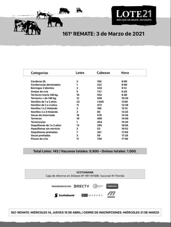 Este lunes 1° de marzo se desarrolló una primera conferencia de prensa virtual para que Lote 21 presente el remate, en la que Rodríguez destacó que "Lote 21 está en la cancha nuevamente”, en un mercado "muy firme, subiendo semana a semana", con un stock de forraje destacado, prácticamente en todo el país. Tras explicar en detalle la oferta y beneficios instó a utilizar los Piques 21 para acceder a los descuentos correspondientes.