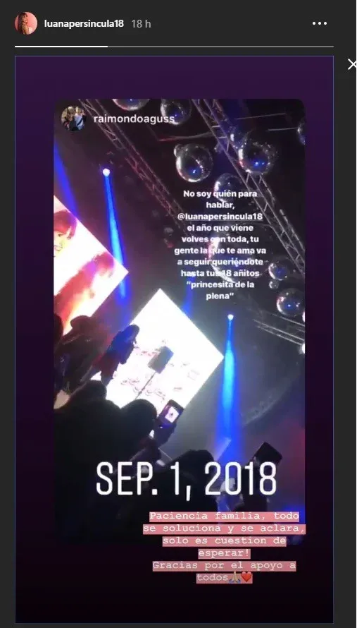 Fuentes del entorno de Luana explicaron que la artista no volverá a cantar hasta que alcance la mayoría de edad. Esta semana cumple los 17, por lo que su ausencia será de un año más. “Paciencia familia, todo se soluciona y se aclara, ¡solo es cuestión de esperar! Gracias por el apoyo a todos”, escribió la cantante en una historia en su cuenta de Instagram.