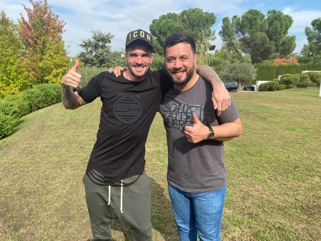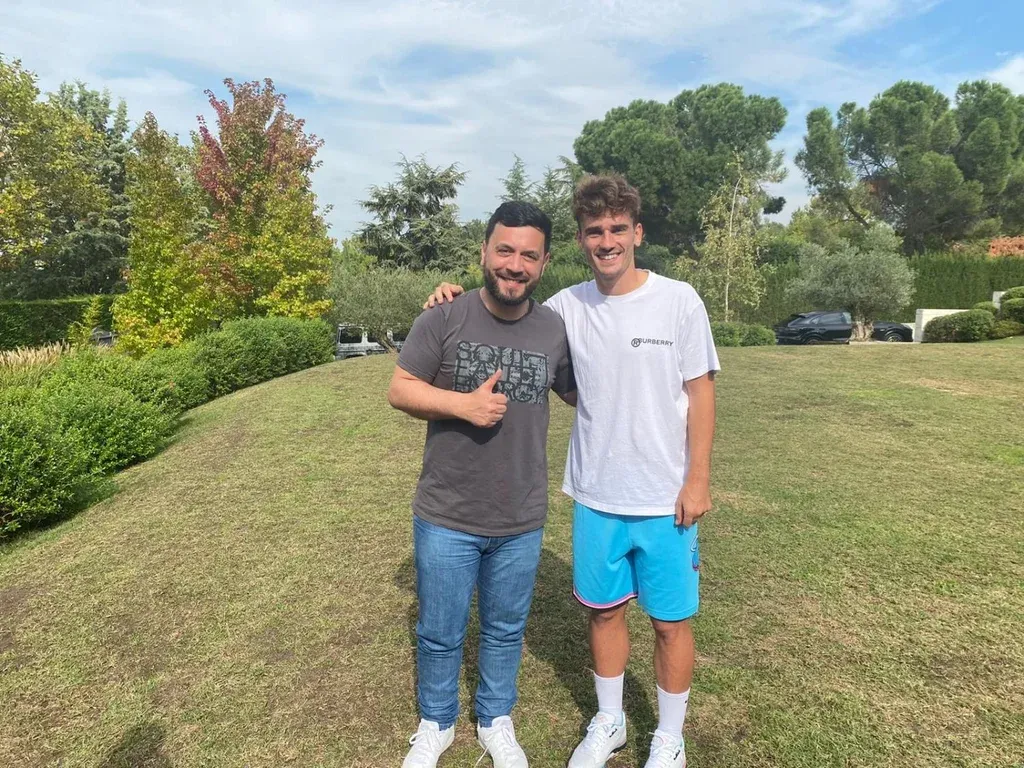 Lucas Sugo con el anfitrión del asado, Antoine Griezmann Además de las fotos, el músico se llevó al menos tres camisetas del equipo autografiadas: una de Suárez, firmada por el delantero uruguayo; otra de Griezmann, también con la rúbrica del jugador, y una tercera con su nombre y el número 9, firmada por todos los invitados a la reunión, y la frase "para el gran Lucas Sugo, con cariño de la plantilla del Atlético de Madrid".