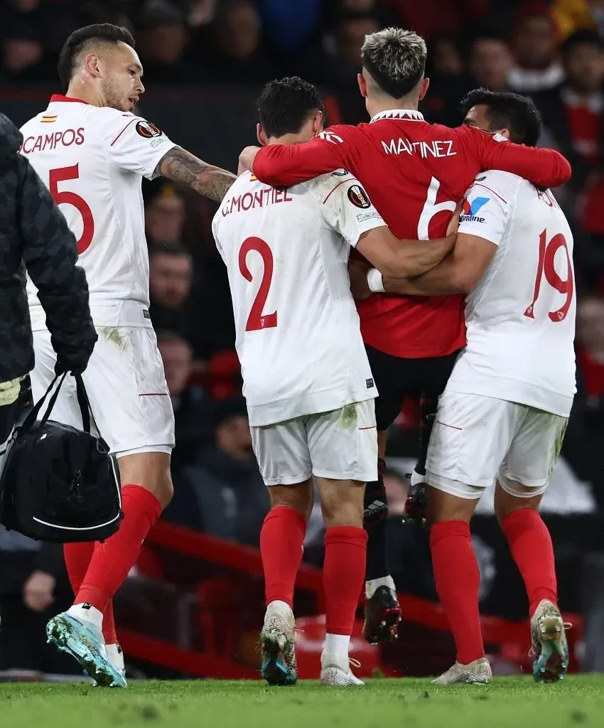 Luego fue atendido y fue retirado en andas por sus compatriotas de la selección y rivales este jueves, Montiel y Acuña, cuando su equipo ya había agotado todos los cambios, por lo que quedó con 10 jugadores, lo que favoreció a Sevilla para lograr el empate minutos después.