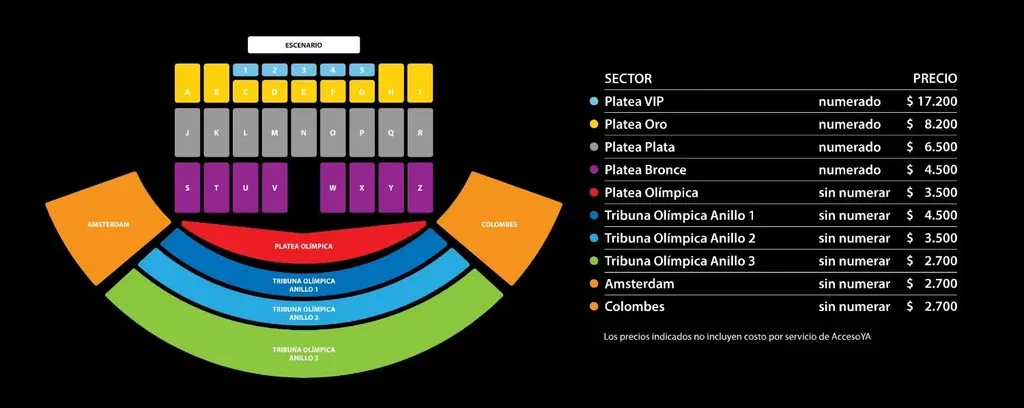 Los precios de las localidades van desde los $2.500 (tribunas Colombes y Ámsterdam sin numerar) a $17.200 (platea VIP). Los precios no incluyen el recargo del 15% por el servicio de la web Accesoya.com, que es el lugar a través del que se adquieren las entradas para el show.