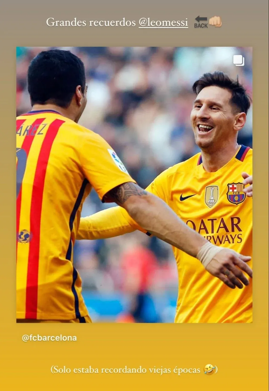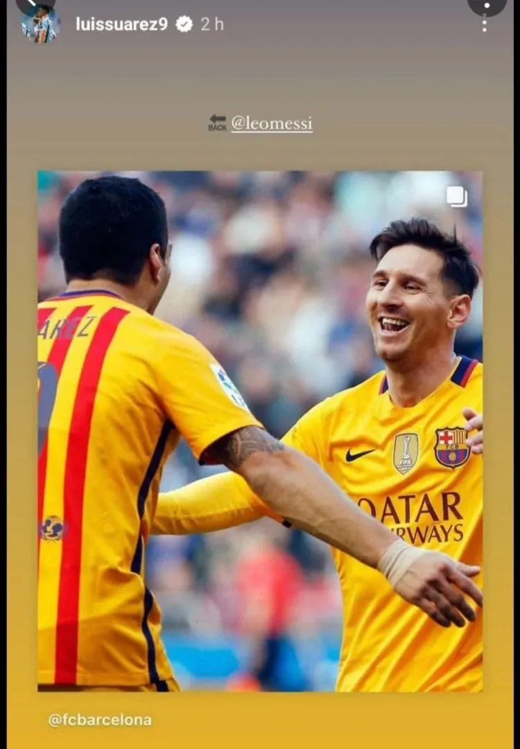 Antes, Suárez había sido más directo con su mensaje ya que le había agregado el emoji "Back" y etiquetó a Messi. Los hinchas y periodistas imaginaron que el mensaje oculto era que le estaba diciendo que vuelva a Barcelona.
