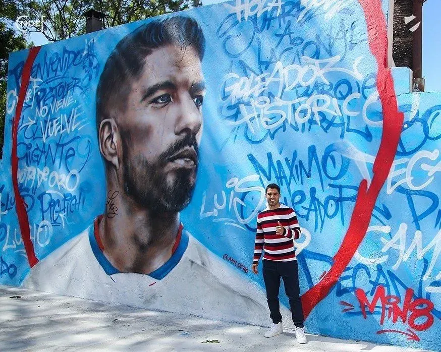Antes de la celebración con la hinchada, Luis Suárez dejó su firma en el mural que tiene en el Gran Parque Central y se sacó una foto con los artistas que lo retrataron