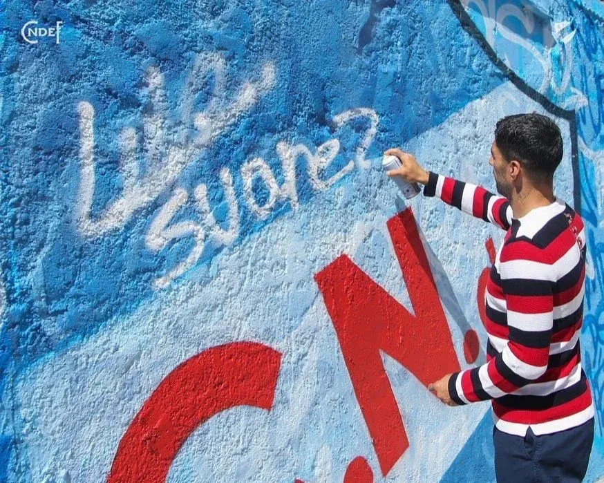 Luis Suárez dejó su firma con aerosol en el mural que Nacional le ofrendó en uno de los accesos al Gran Parque Central y se sacó una foto con los autores de la obra.