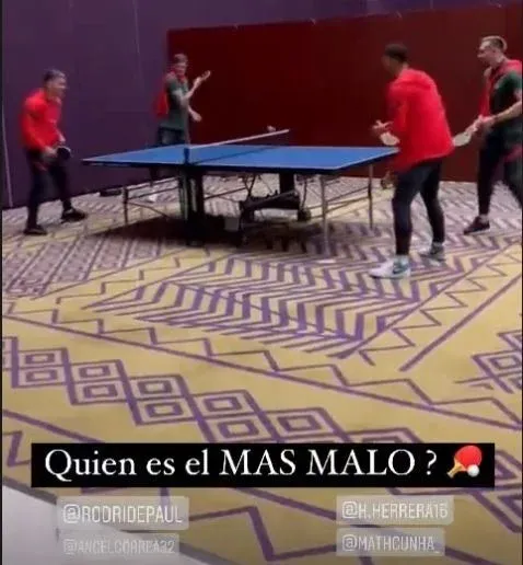 El delantero uruguayo filmó un partido de tenis de mesa entre sus compañeros Rodrigo de Paul, Ángel Correa, Héctor Herrera y Matheus Cunha y lo publicó en sus historias de Instagram con la siguiente pregunta: "¿Quién es el más malo?".