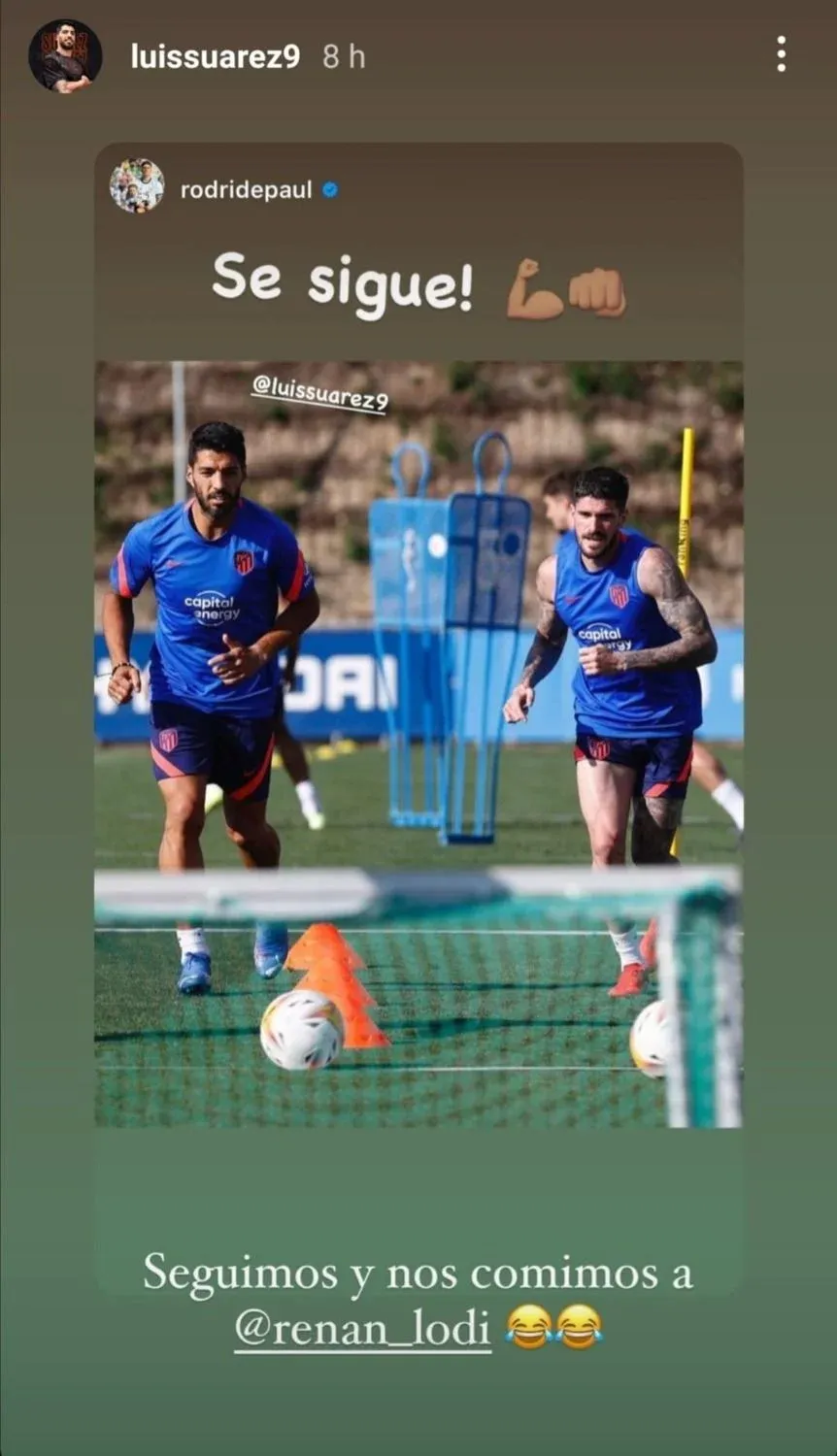 Instagram de Luis Suarez Luis Suarez bromea sobre una victoria de entrenamiento junto a Rodrigo de Paul El próximo partido del Atlético de Madrid lo jugará de local el domingo la hora 14:30 contra Elche.