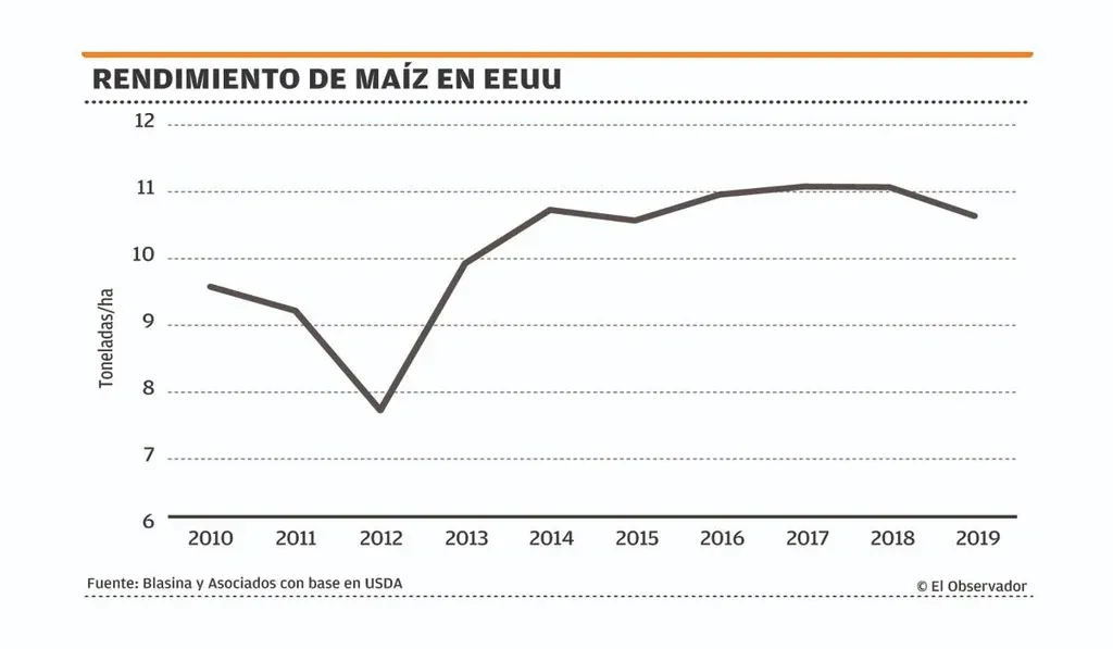 Este lunes en cambio, el maíz cerró al límite de bajas permitido y arrastró al trigo y la soja. Y las bajas siguieron el martes, confirmando un nuevo año de abundante abastecimiento en maíz. La semana pasada se había cortado una racha de tres semanas de baja, justamente por la expectativa que generaba este reporte y alguna amenaza de faltante de agua y exceso de calor sobre los cultivos. Pero las amenazas del clima, en su momento más cálido del año, no se concretan hasta ahora y es altamente probable que Estados Unidos logre un rendimiento sorprendentemente alto para las condiciones en que fue sembrado el cultivo.