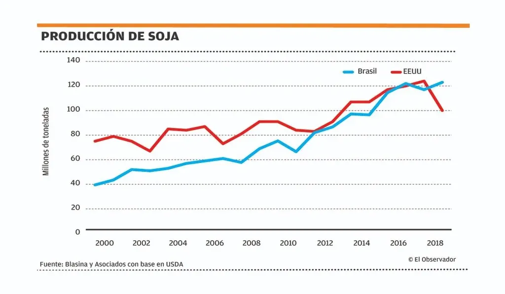 La cosecha de soja de EEUU cae fuerte, de 124 a 100 millones de toneladas, con lo que Brasil pasa a liderar por primera vez la producción mundial con 123 millones de toneladas.