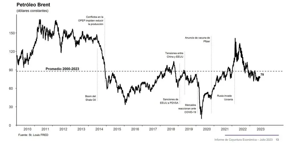 Los precios del petróleo también se movieron al alza en las últimas semanas, debido principalmente a recortes en la oferta de la OPEP, y también de Rusia. El valor promedio del crudo Brent en julio fue de unos U$S 78, y en junio se ubicó cercano a U$S 75. Así se movió cercano al promedio de los últimos 20 años, como muestra esta gráfica de la consultora Grant Thornton.