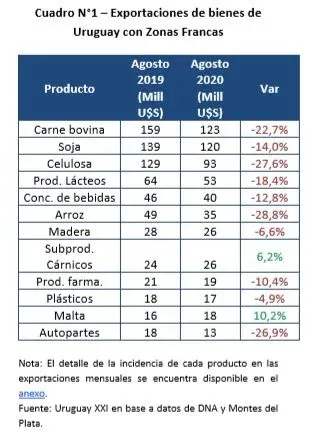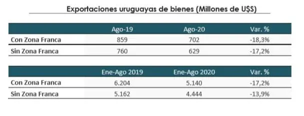 En agosto de 2020 las solicitudes de exportación, incluyendo zonas francas, mostraron una caída interanual de 18,3%, al situarse en US$ 702 millones.