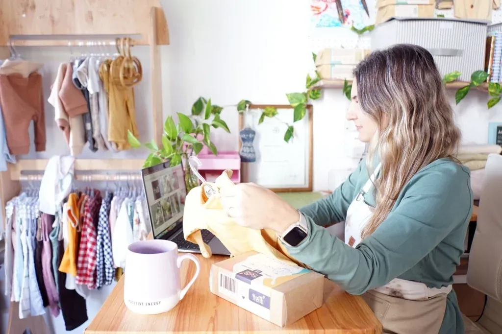 Valentina produce la ropa en un taller en su casa.