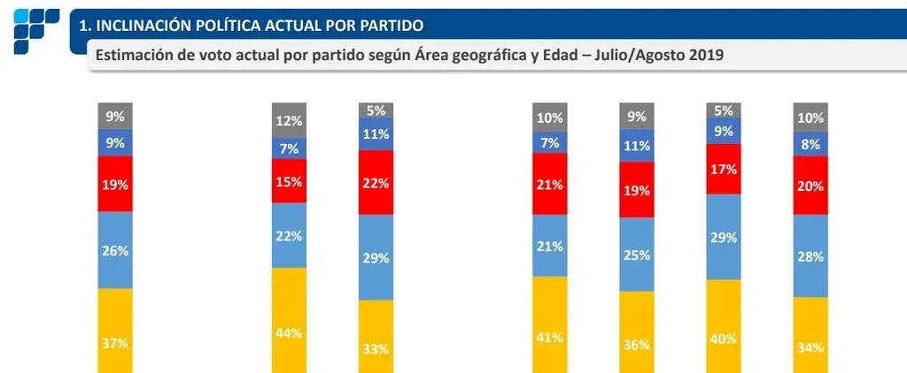 A modo de ejemplo, Cabildo Abierto (Guido Manini Ríos) vence al Partido Colorado (Ernesto Talvi) en el segmento más pobre de la población, mientras que los colorados empatan con el Partido Nacional (Luis Lacalle Pou) en el segmento más joven de la población (de 18 a 32 años).