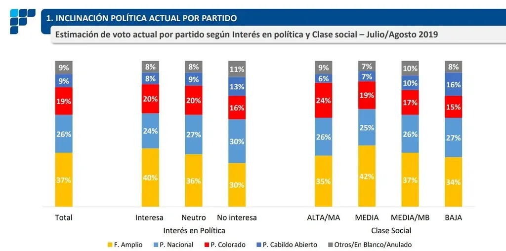 Gana entre los más jóvenes, en los adultos del medio y en los mayores. Gana en los más ricos y en los más pobres. Gana en los más interesados por la política pero, sin embargo, empata con el Partido Nacional entre aquellos a los que menos le importa. A su vez, la diferencia numérica en estos casos cambia al igual que las distintas disposiciones en el bloque opositor.