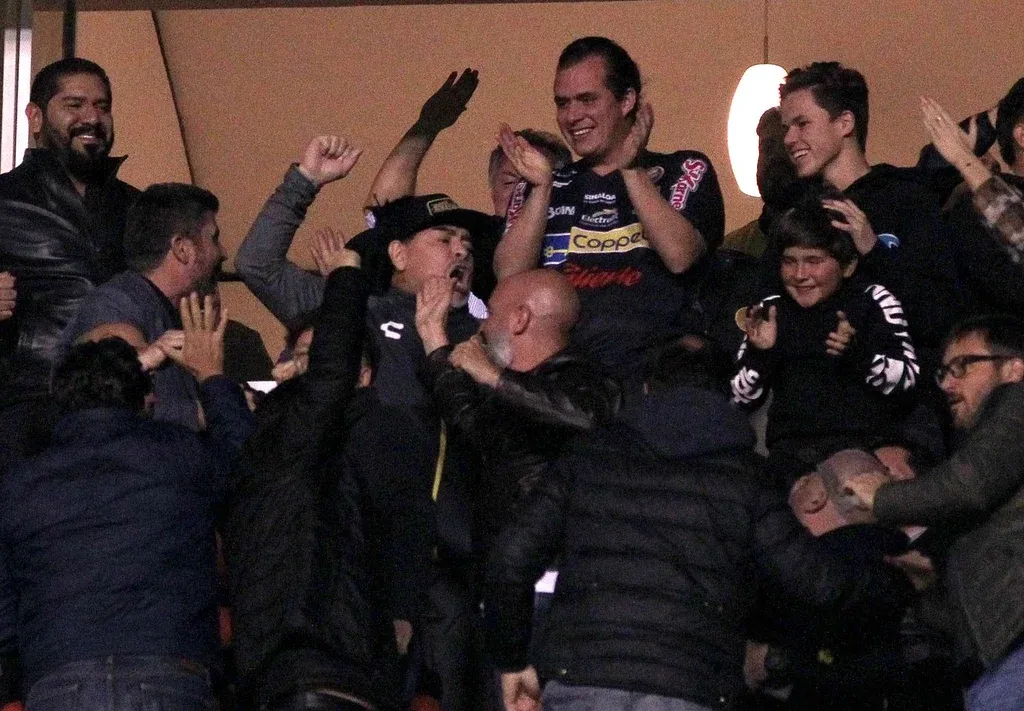 Maradona, por estar suspendido, observaba tranquilo sentado en un palco mientras su auxiliar Luis Islas gritaba las indicaciones desde la banca.