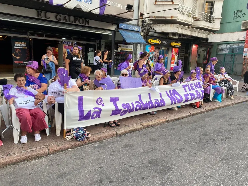 Un grupo de mujeres de un hogar del Cerro se reunió con una pancarta que dice "La igualdad NO tiene edad". Algunas de ellas también tenía algunas hojas con varias consignas: "Viejas presentes", "No me des un día, dame mis derechos".