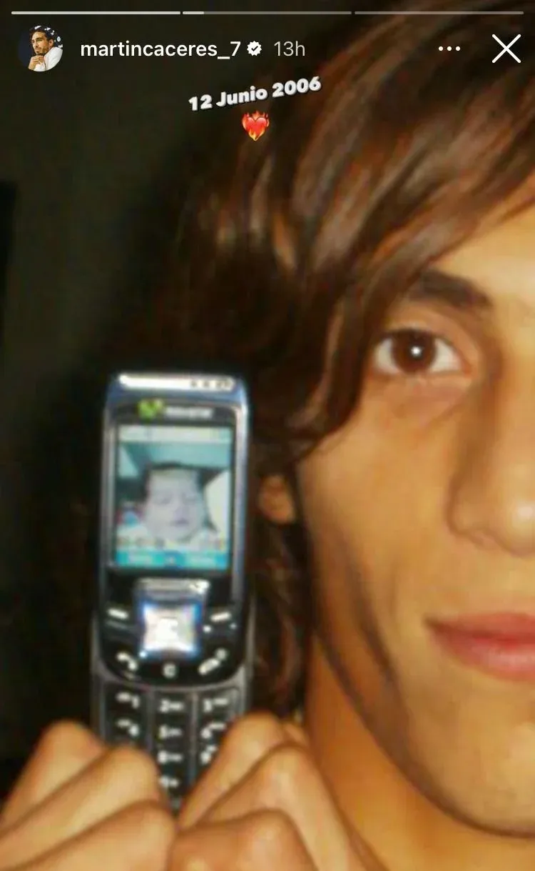El Pelado publicó una foto de él en 2006 (año que debutó en Primera división, en Defensor Sporting) con un teléfono celular Nokia de la época y una foto de la bebé.