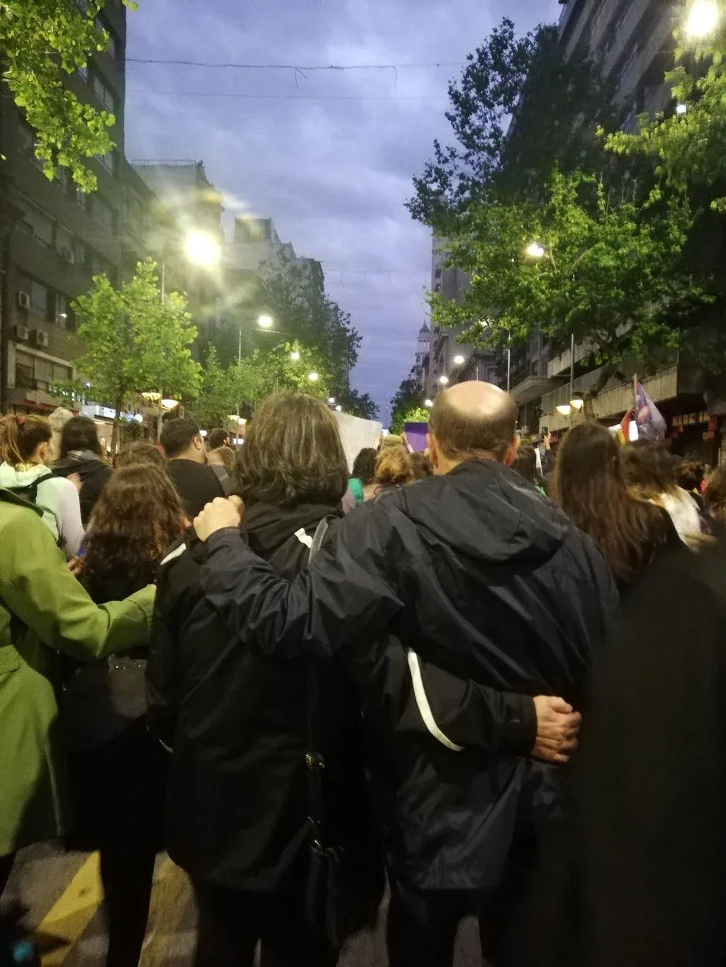 Flanqueado por su familia, caminó desde la Plaza Independencia hasta la explanada de la Intendencia de Montevideo. En el trayecto se animó incluso a entonar algunos de los cánticos, como el dirigido al líder de Cabildo Abierto, Guido Manini Ríos, que decía: "Manini vení a mirar a las mujeres cuando salen a luchar".