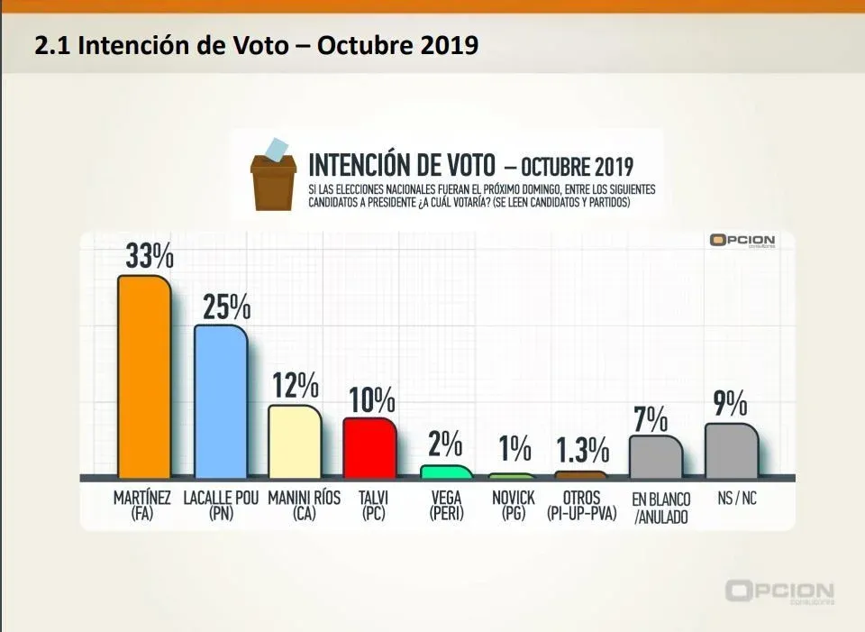 Según la encuesta de Opción realizada entre el 2 y el 9 de octubre, Martínez registró una intención de voto de 33%, seguido de Lacalle Pou con 25%, Manini Ríos con 12% y Talvi con 10%.