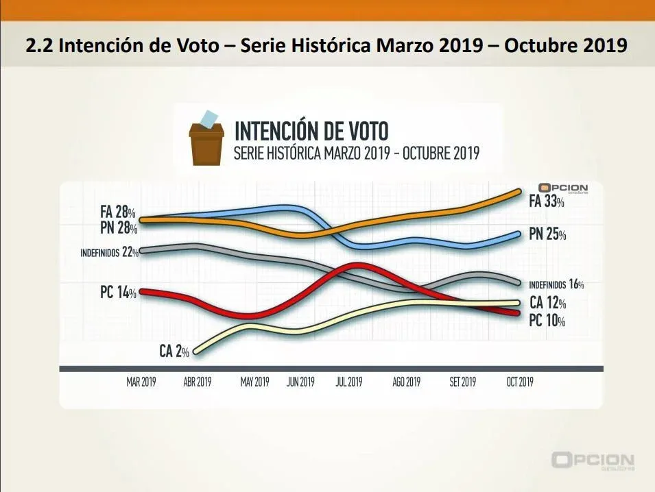 El análisis de los datos realizado por Opción Consultores remarcó que “el Frente Amplio y Partido Nacional se consolidan respectivamente en el primer y segundo lugar de cara a la elección de octubre”. El reporte marcó que el oficialismo creció mes a mes desde las elecciones internas debido a su “mayor nivel de fidelización de votantes”, mientras los nacionalistas se ubican “en un claro segundo lugar con 25%, lejos del Frente Amplio pero también de los otros dos principales partidos opositores”.