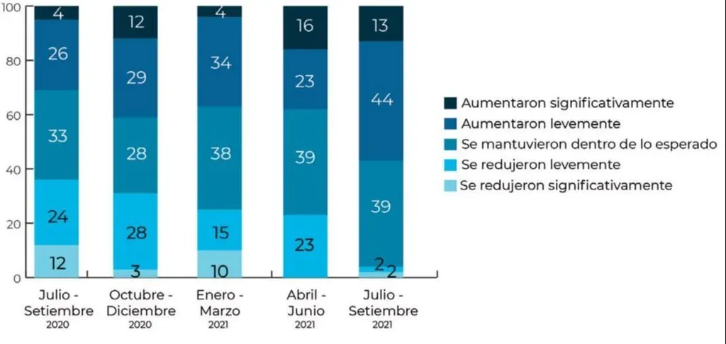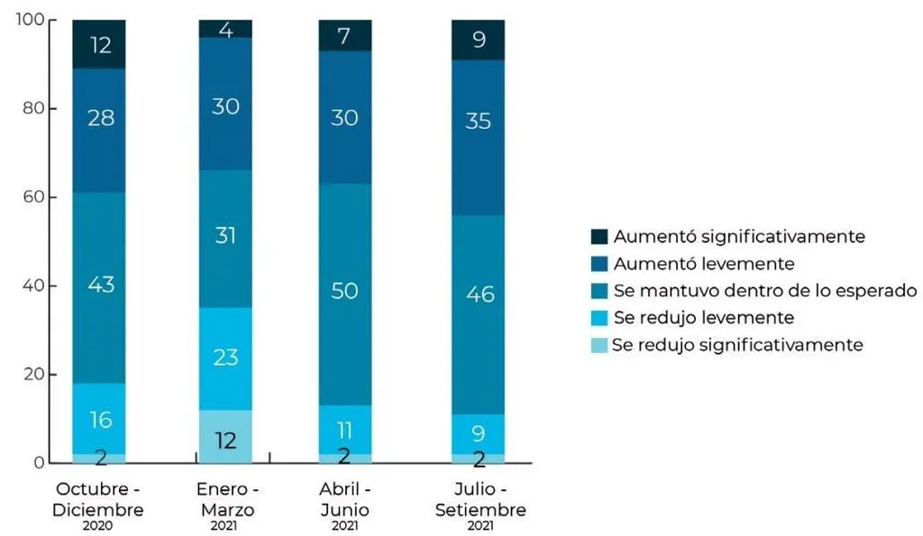 Con respecto a las oportunidades de negocio, la concreción entre julio y setiembre de 2021 se mantuvo constante para prácticamente la mitad de las empresas que participaron del relevamiento, mientras que para un 44% de las empresas se generó un aumento. A su vez, 87% de las empresas relevadas experimentó nuevas oportunidades de negocio de diversa magnitud en este trimestre.
