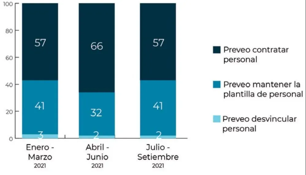 Con respecto a cifras de empleabilidad, el 54% de las empresas participantes contrató personal durante el trimestre julio-setiembre 2021, mientras un 39% mantuvo su plantilla y 7% desvinculó personal.