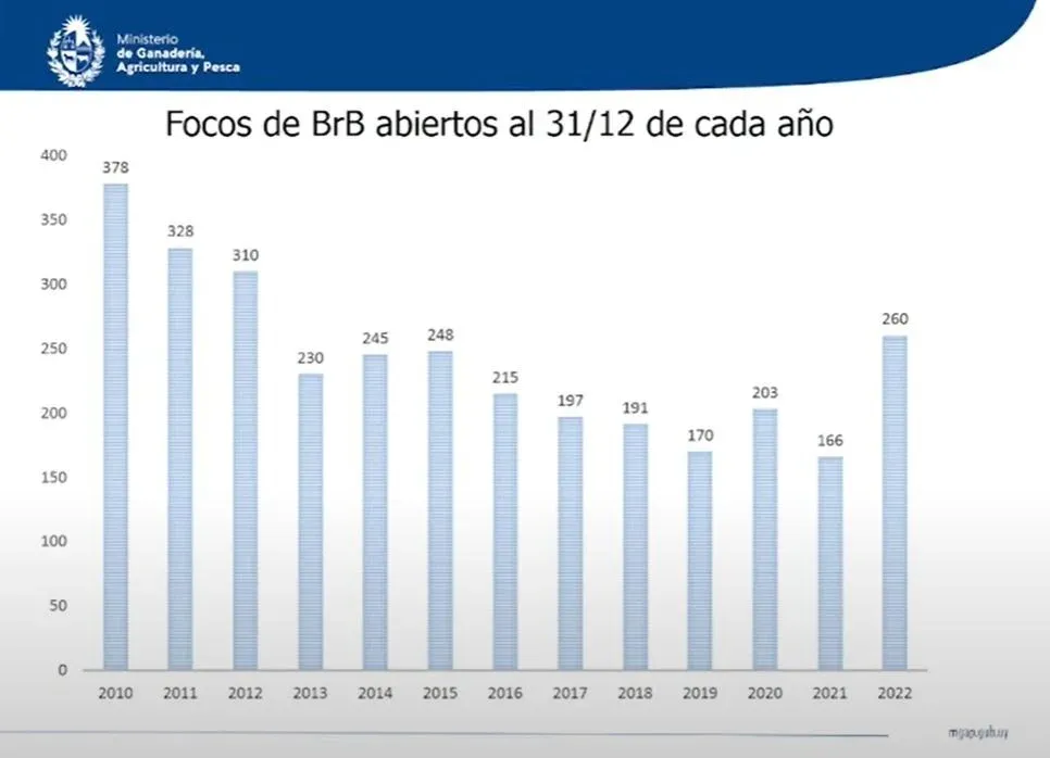 Hay que remontarse a 2012 para encontrar una cantidad de focos como la actual, ese año había 310 en todo el país cuando se llegó al 31 de diciembre. Según los registros del MGAP, en los últimos años, en 2010 se dio la mayor cantidad de focos de la enfermedad, 378 en total en el momento del cierre del ejercicio anual.