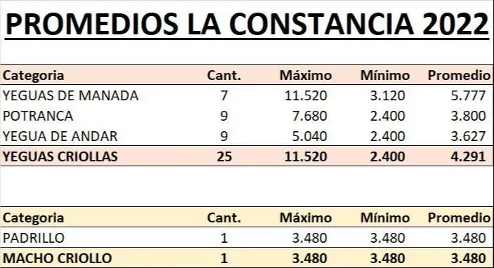 Los Criollos se colocaron “a muy buenos valores”, agregó. Las yeguas de manada se vendieron a US$ 5.777 de promedio, las potrancas a US$ 3.800, las yeguas de andar a US$ 3.627, las yeguas Criollas a US$ 4.291 y un padrillo a US$ 3.480.