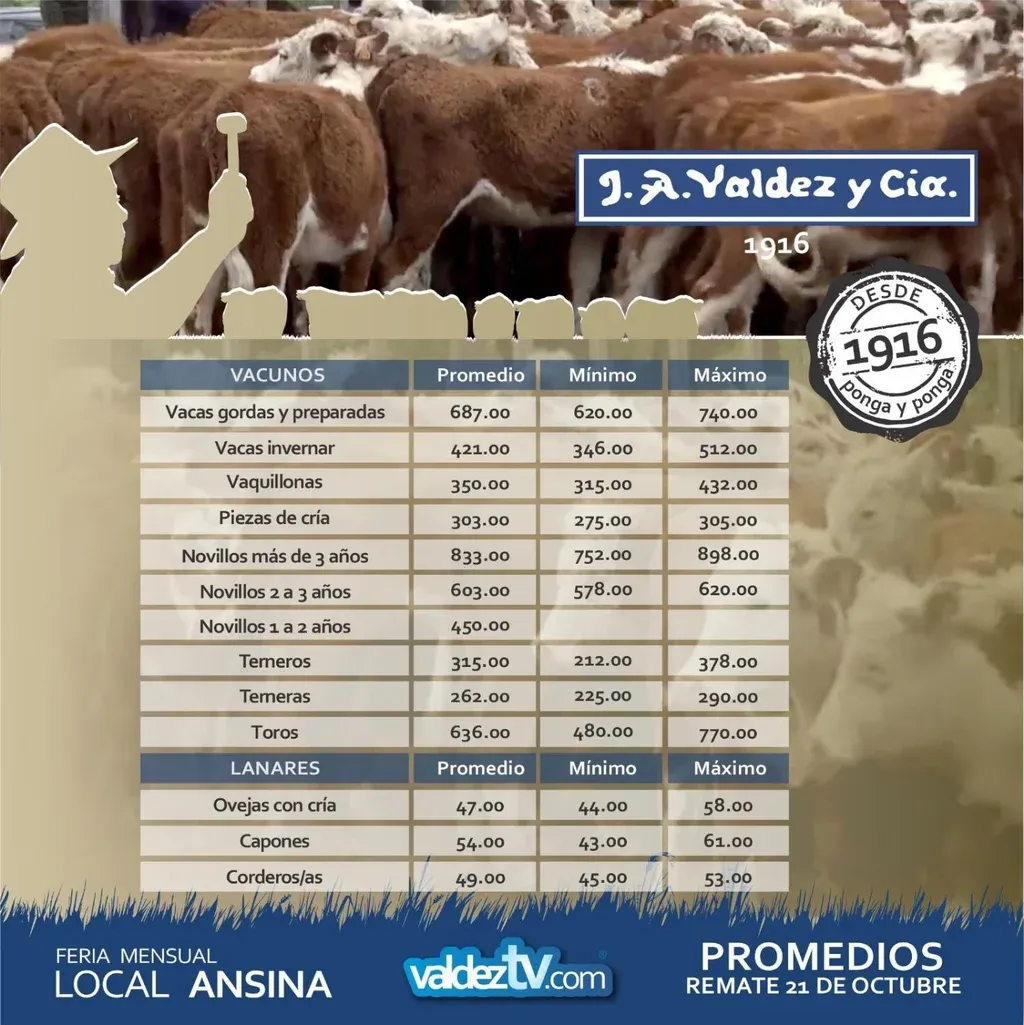 Además, ese mismo día, desde el local Ansina, se desarrolló una de las ferias mensuales a cargo de Valdez y Cía, con vacunos y lanares, registrándose los siguientes resultados: