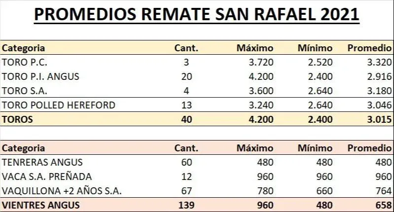 Promedios obtenidos en el remate de San Rafael.