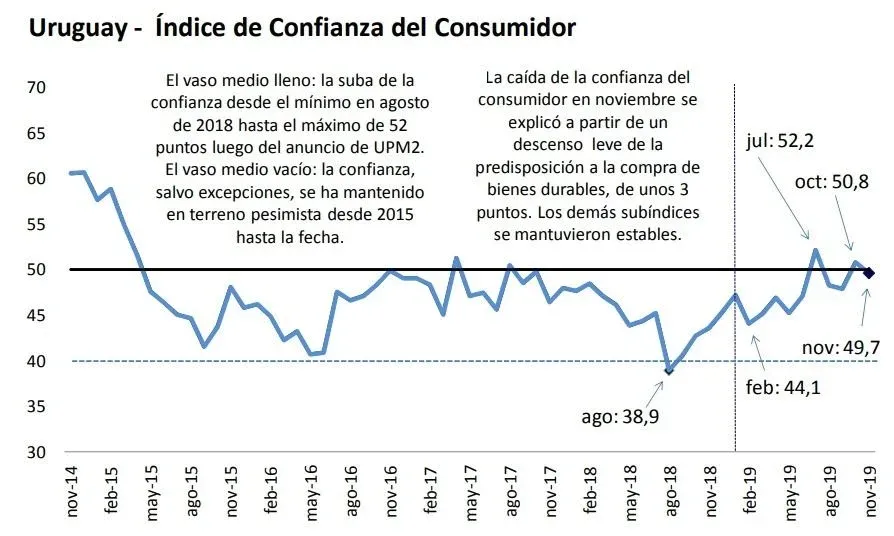 “El registro más alto del año fue en julio y coincide con el anuncio de UPM2”, aseguró Cavallo. Además agregó que desde el 2015 la confianza se mantiene entre 40 y 50.