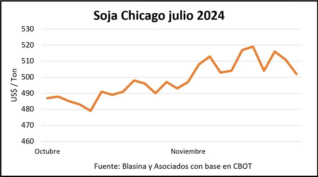 La cotización en Chicago, que había tocado los US$ 520 para la posición julio 2024, cerró en US$ 502 este viernes.