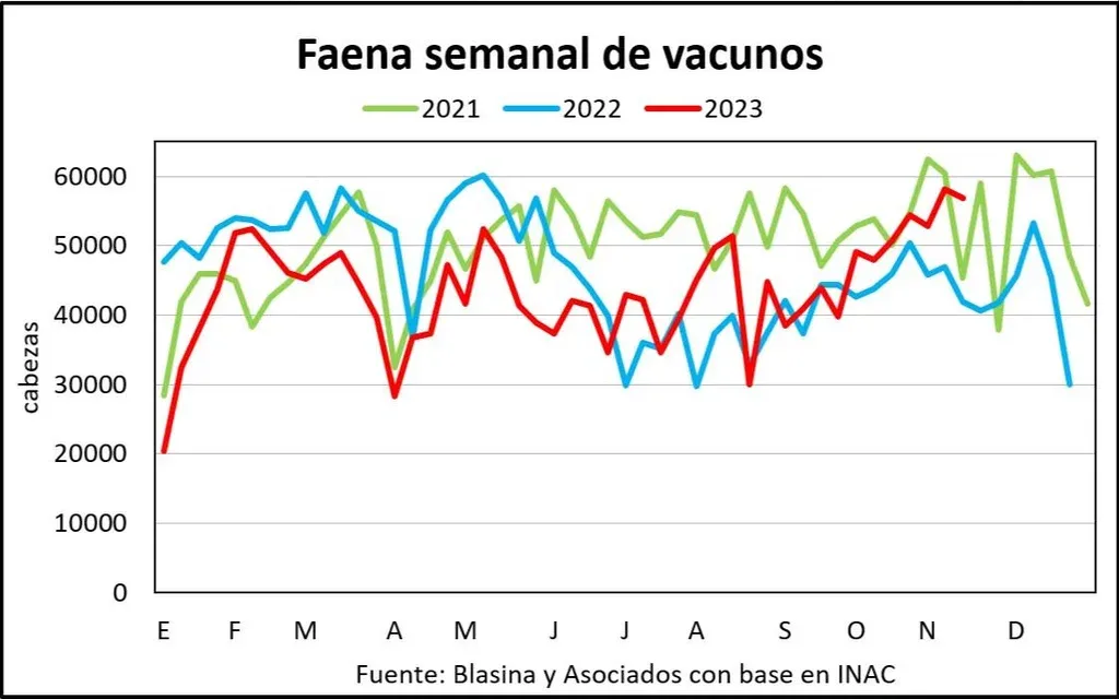 Hay expectativa sobre cómo se comporte la faena luego de cinco semanas consecutivas arriba de 50.000 cabezas. En la última semana fue la segunda más alta del año con 56.834 vacunos. En lo que va de noviembre la faena supera en 19% el volumen registrado en el mismo periodo del año pasado.