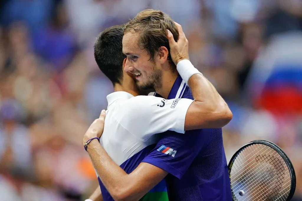 Al ver que se le escapaba el partido más importante de su vida, Djokovic pagó su frustración rompiendo una raqueta en el segundo set pero, zanjada la derrota, terminó reconociendo y abrazando en la red a Medvedev.