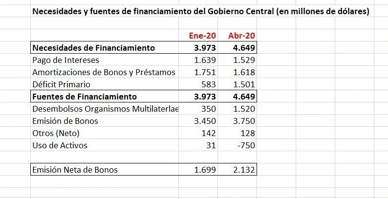Del monto total de dinero, hay aproximadamente US$ 3.750 millones que se planean conseguir mediante la colocación de bonos internacionales y otros emitidos en el mercado doméstico. Las otras fuentes de financiamiento serán los créditos de organismos internacionales (US$ 1.520 millones), otros (US$ 128 millones y uso de activos de reservas del gobierno central (US$ 750 millones), se explicó.